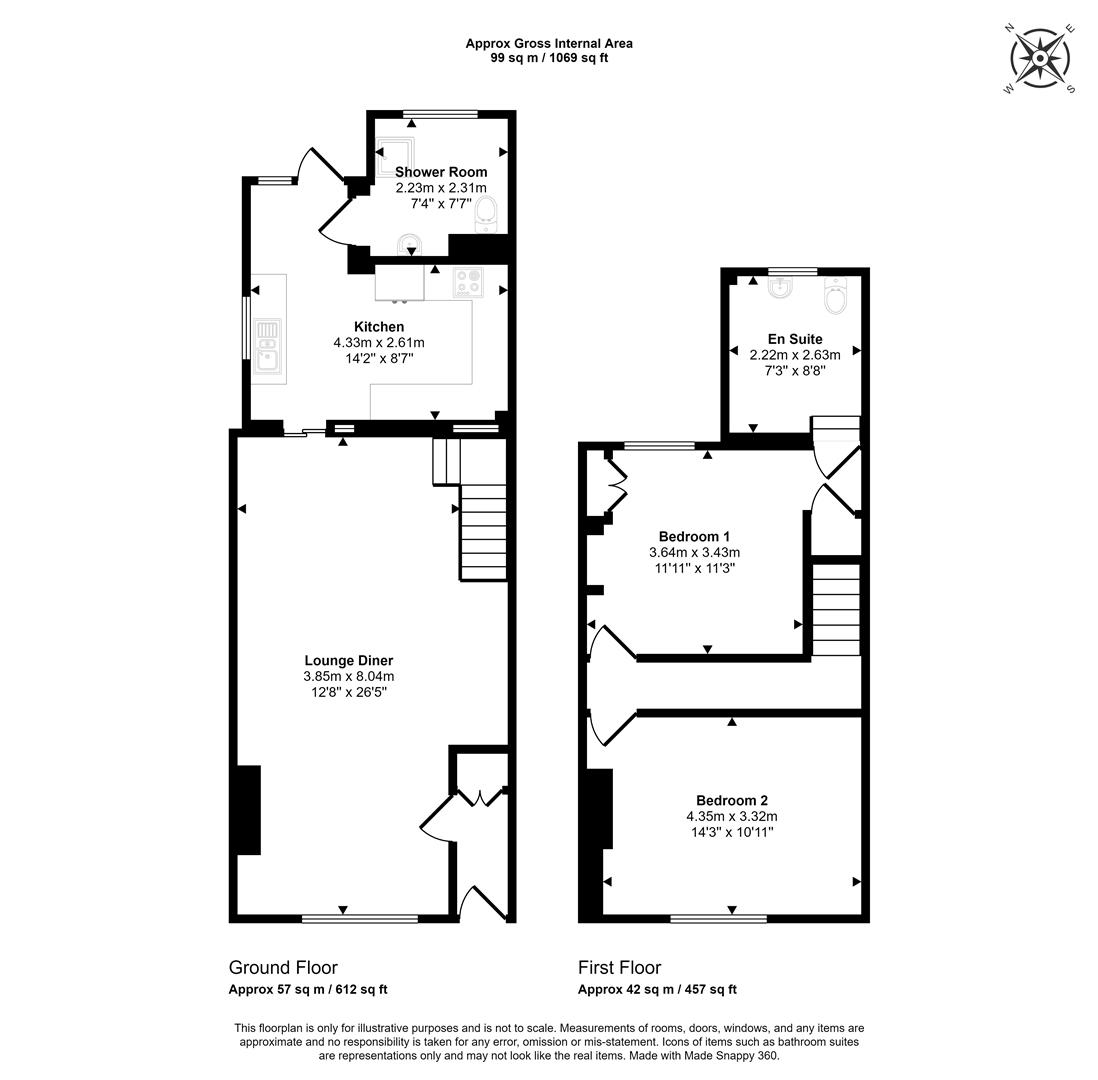 The ground floor comprises of an entrance hall, open-plan living/dining room, kitchen and shower room. On the first floor are two double bedrooms and a third bedroom/bathroom accessed via bedroom two.