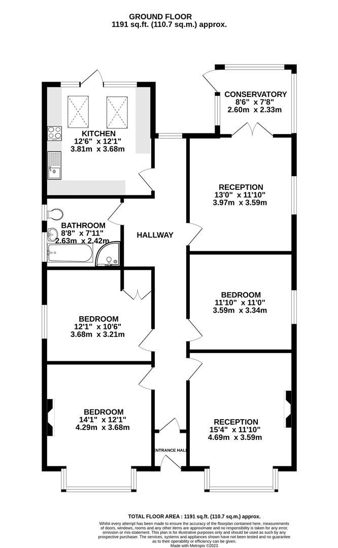 The property is arranged with three double bedrooms; the master at the front boasts a bay window and coving. Two additional double bedrooms flank the central hallway—one equipped with a wash hand basin and fitted wardrobe, and the other showcasing a feature fireplace to the chimney breast and built-in storage.