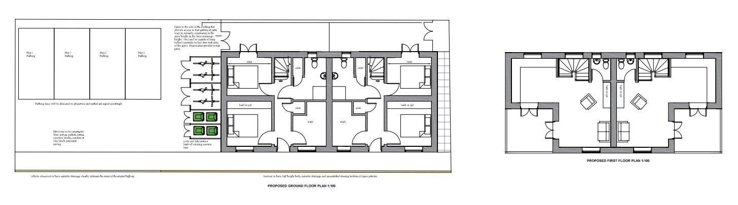 Each house will comprise two double bedrooms, a study and shower room on the ground floor with an open-plan kitchen/dining/living room and cloakroom on the first floor with two sets of double doors onto a roof terrace. There will be two parking spaces for each house and gardens to the rear.