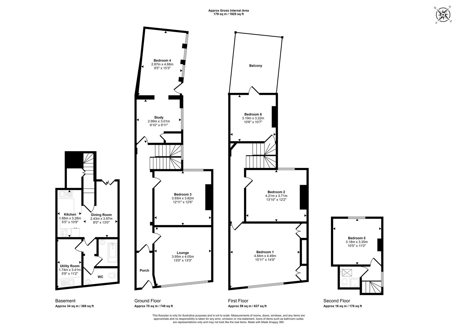 The ground floor accommodation is arranged to provide a living room and two double bedrooms with stairs leading to the basement level and first floor. The basement level comprises a kitchen/diner, utility room, bathroom and WC. On the first floor are three further bedrooms (one with access onto the rear roof terrace) and stairs leading up to the sixth bedroom and a shower room.