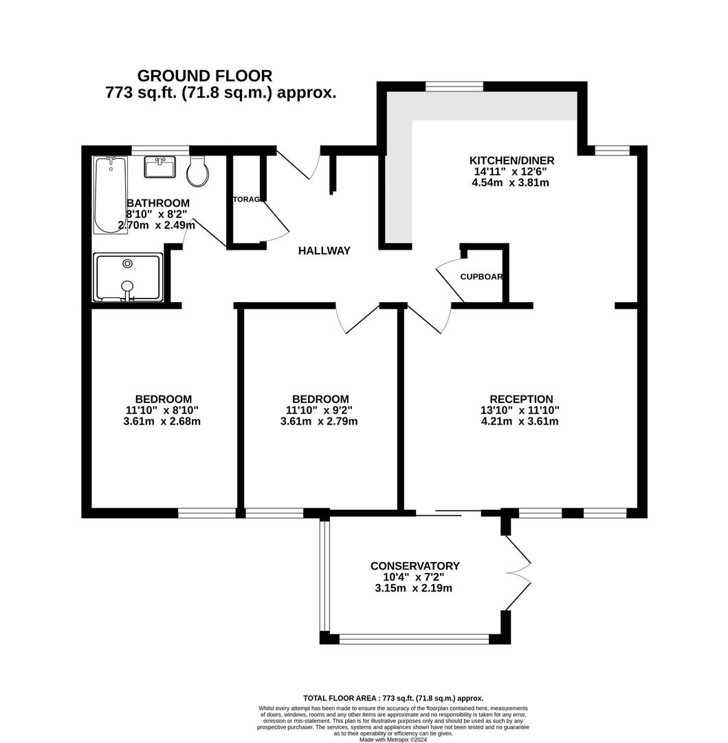 The entrance hallway provides ample storage, with two convenient cupboards and an airing cupboard housing a gas combi boiler. Toward the rear, a bright living room opens into a conservatory, offering a lovely view over the garden. At the front, the open-plan kitchen and dining area boasts a modern design, ideal for cooking and entertaining.