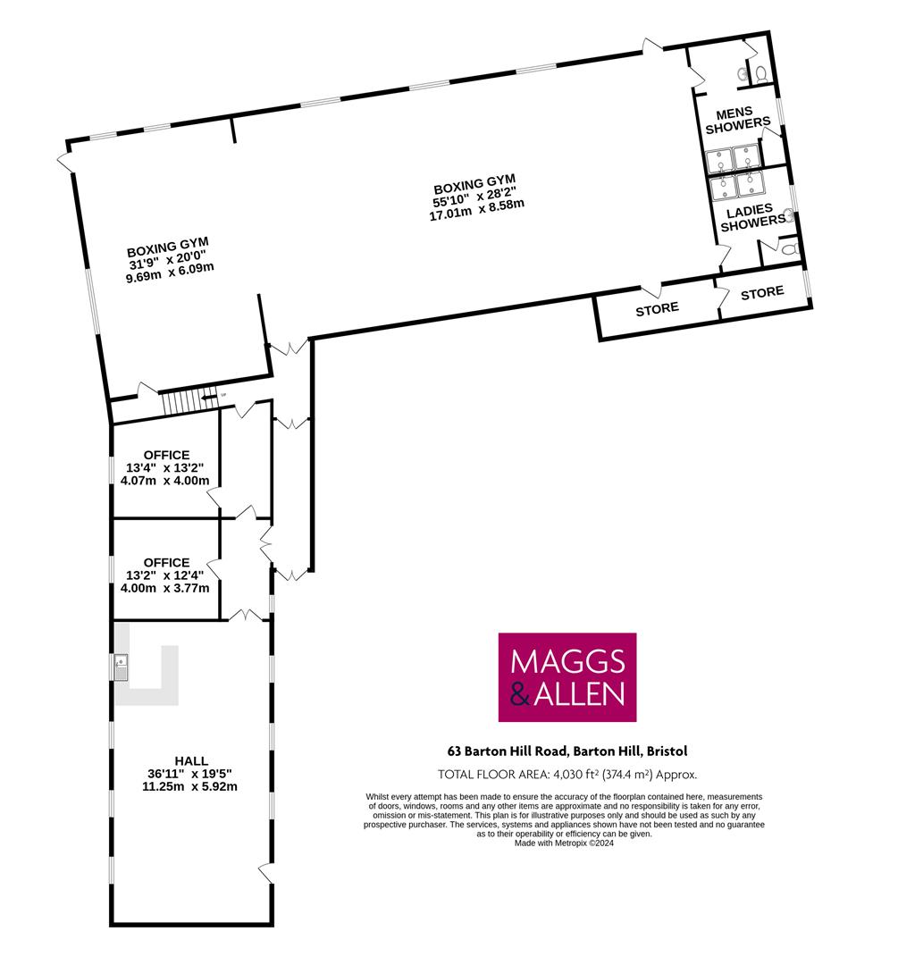 The existing single storey commercial buildings (approx. 4,030 ft²) are arranged in an L-shape to provide a large hall with kitchen area, two offices, a split level boxing gym with vaulted ceiling, male and female shower rooms and store rooms.