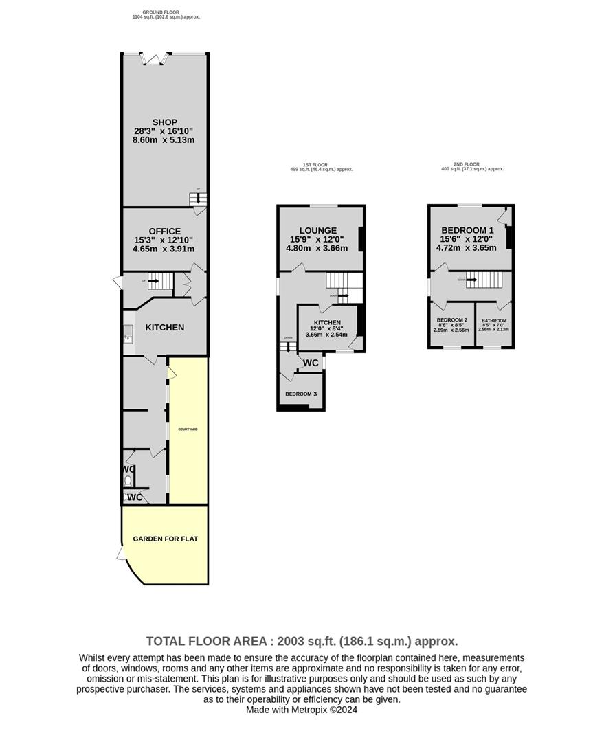 The ground floor is is arranged as a retail unit to the front, with rear office, kitchen, further stores, male and female toilets, with an enclosed courtyard.