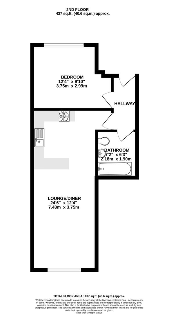 The living space is a light and bright room benefitting from large triple sash windows to the far elevation, high ceilings and exposed original floorboards. The kitchen is fitted with a range of matching base and wall-mounted units, and comprises an integrated hob, washer/dryer, sink. extractor hood and dishwasher. Cupboards are wood effect and complemented by black worktops. Sat adjacent is a three-piece bathroom comprising white tiling, shower-over-bath, WC and basin.