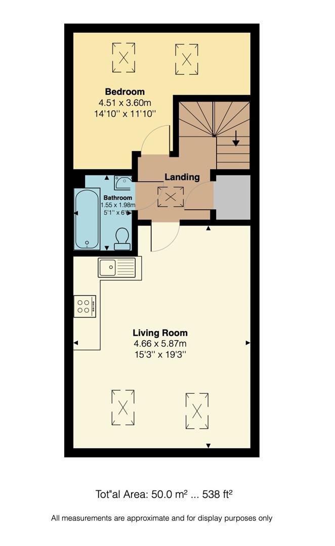 The flat is situated on the top floor and comprises a generous open-plan kitchen/dining/living room with modern fitted kitchen units and large Velux windows and skylights that bathe the room with natural light. There is a well-proportioned double bedroom, a contemporary bathroom and a generous landing with storage cupboard.
