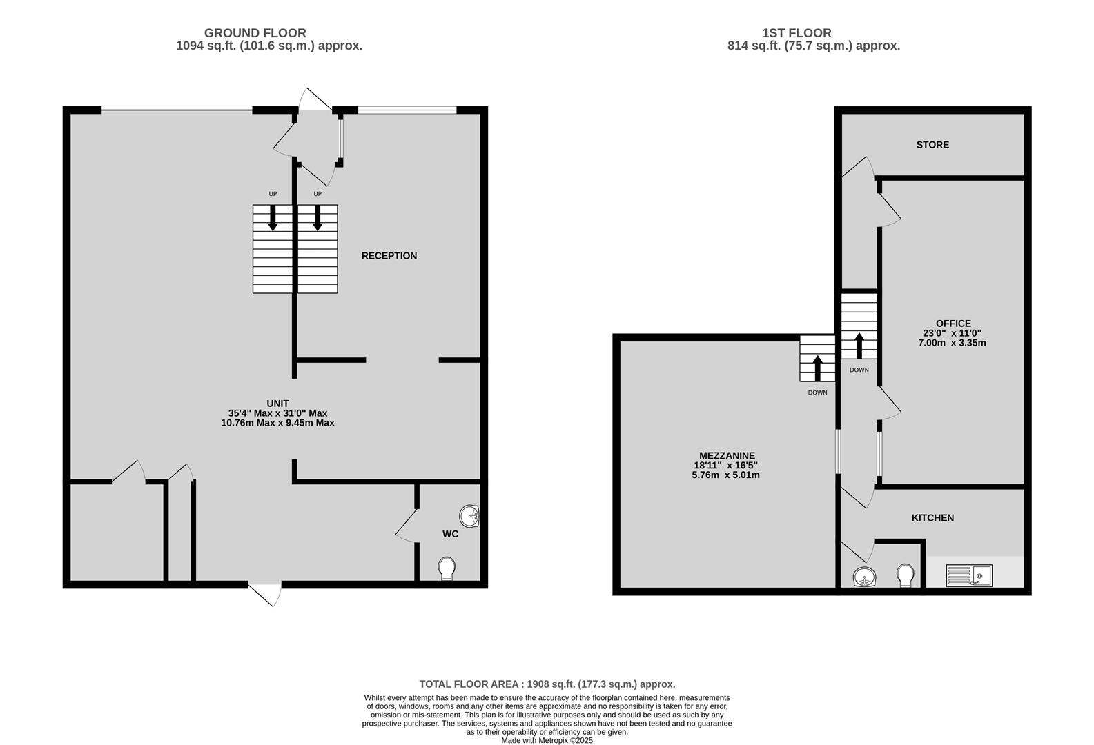 This light industrial unit extends to approximately 1,908 sq ft and is arranged to offer a versatile mix of workshop, office, and storage accommodation, ideal for a variety of business uses. The ground floor comprises a spacious workshop area, reception, storage space, and a WC. Above, a mezzanine level has been fitted to provide office accommodation, additional storage, and a convenient kitchen area. Key features include: 3 allocated parking spaces, roller shutter door access and air conditioning in the office areas.