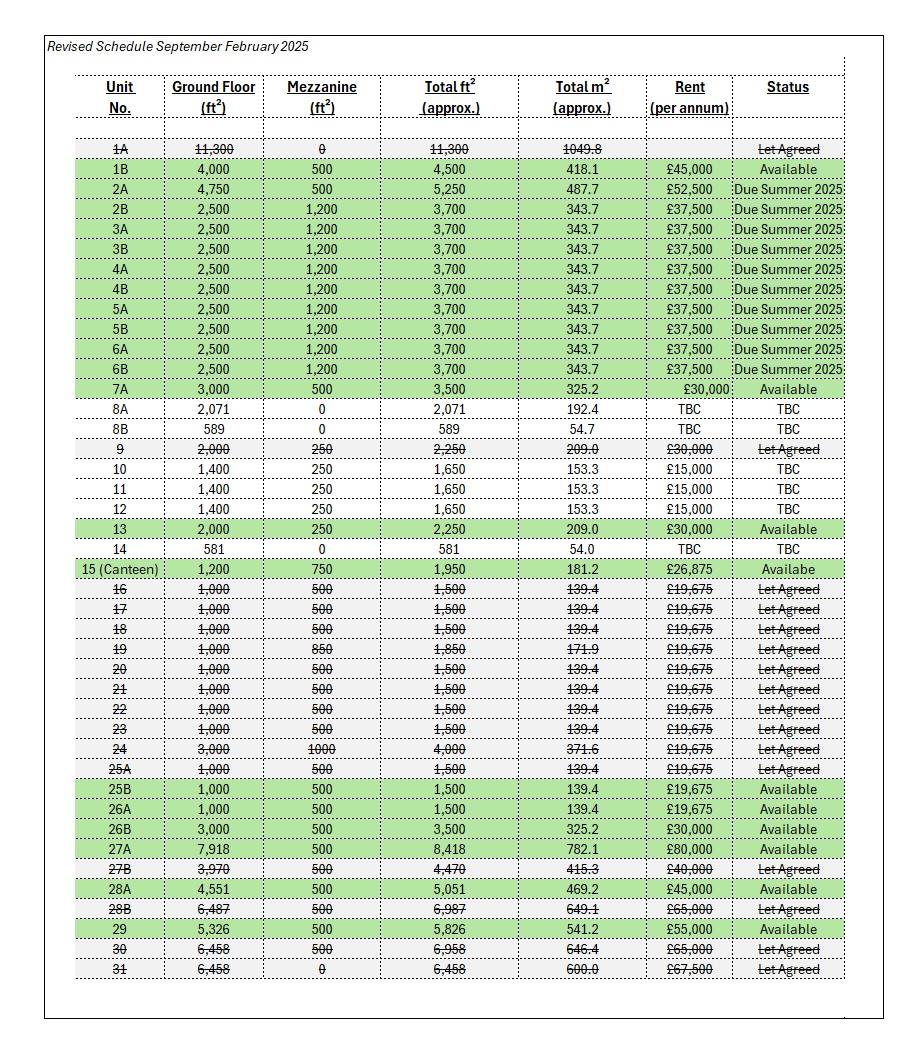 The Printworks is an old factory building first established in 1880 which is undergoing significant redevelopment to provide 31 new industrial units. The units benefit from small mezzanines providing an office, kitchen and wc, which can be extended if required. The units sub 9,000ft² benefit from an internal height of circa 8m and the larger units have an internal heigh of circa 17m. 3-Phase electricity is also available if required and parking is provided for all of the units and additional parking is readily available if required. A large on-site café is also proposed.