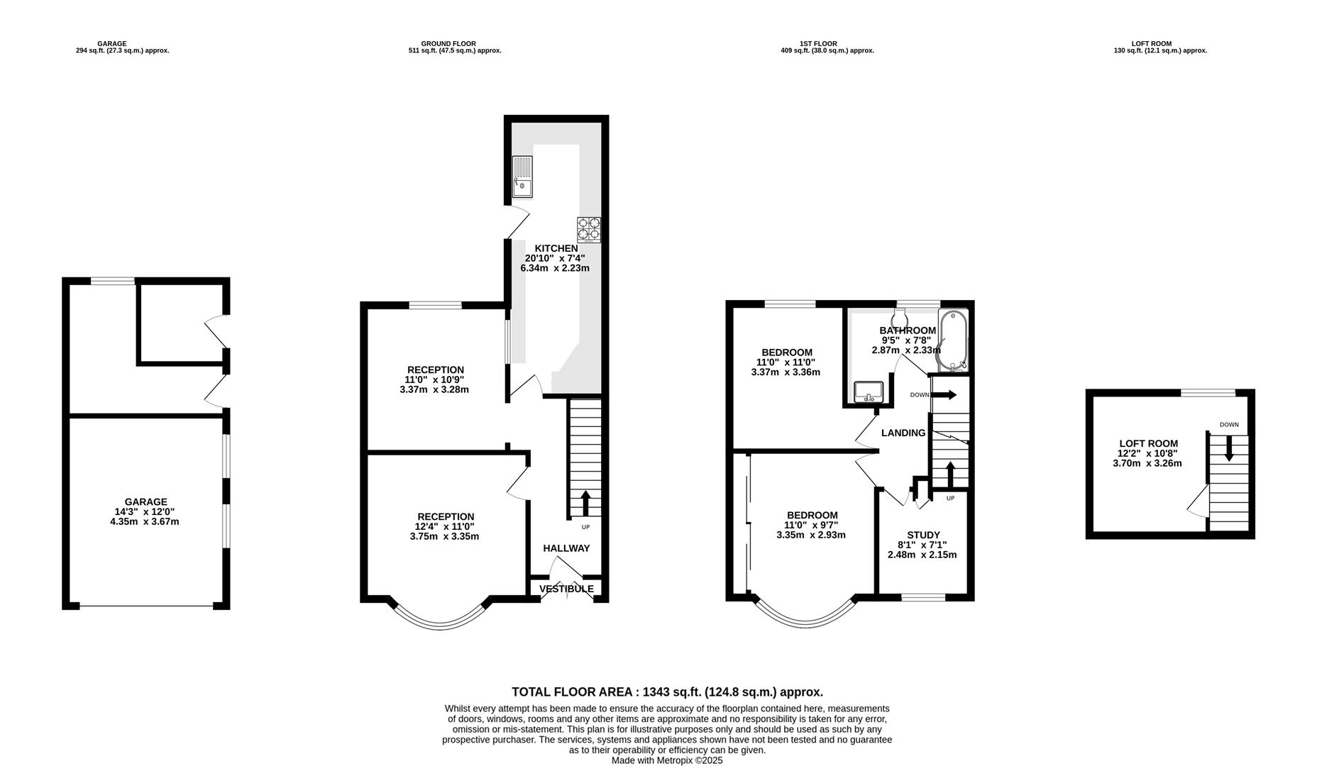 The first floor comprises two double bedrooms, with the master benefiting from fitted wardrobes along one wall. Located off the landing is a dedicated study with a storage cupboard, which also houses the staircase leading up to the versatile loft room—ideal for an occasional guest room or additional flexible space. The recently fitted bathroom has been completed to a high standard, featuring distinctive brushed gold fittings, dark grey tiling, a WC, a shower-over-bath, and a hand wash basin.
