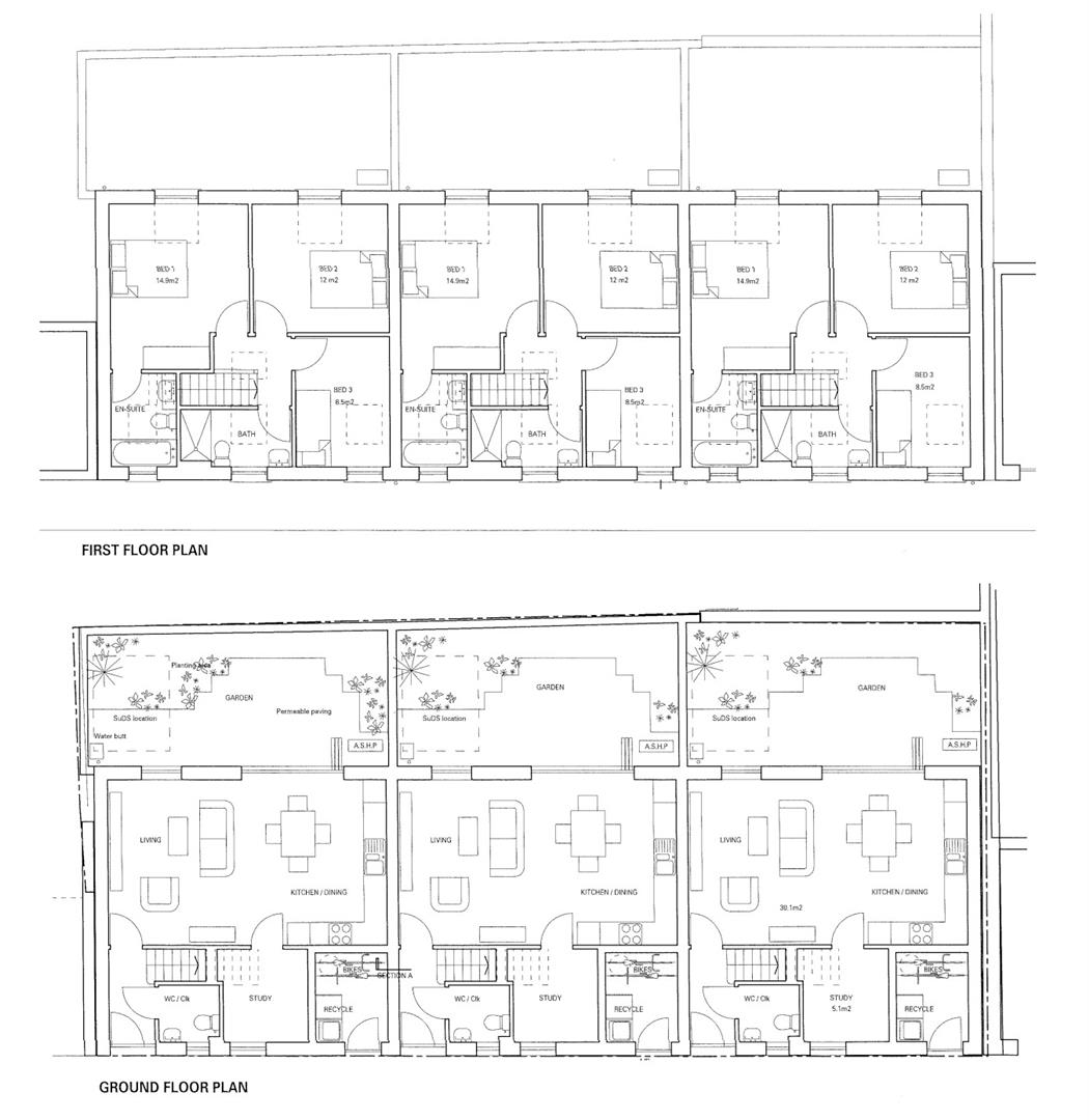 HOUSE 3 (103 m²) - Open-plan Kitchen/Dining/Living Room, Study, Cloakroom, 3 Bedrooms, Bathroom, En-suite.